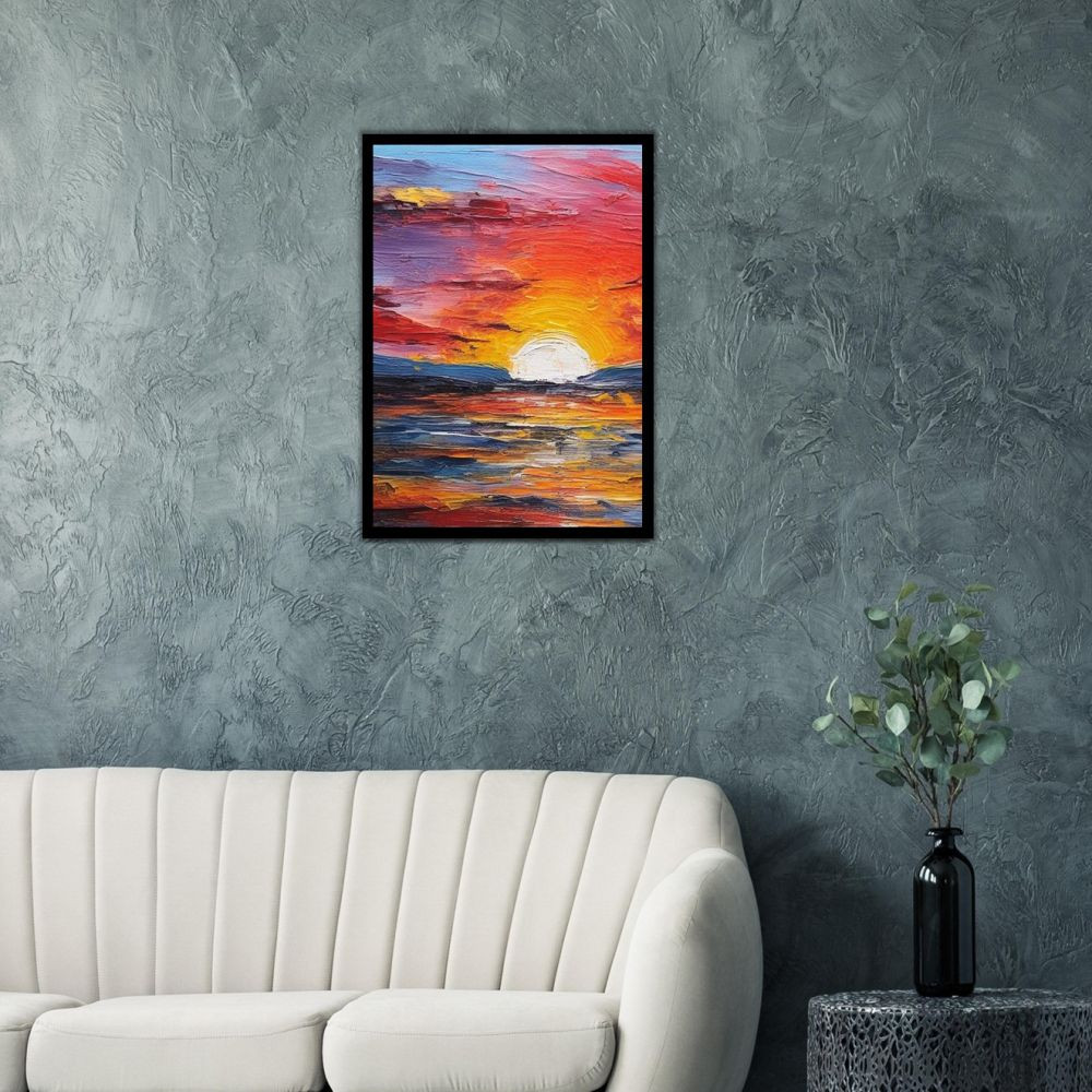 Das Wandbild ist eine faszinierende Darstellung eines malerischen Sonnenuntergangs über dem Meer, die mit der lebendigen und vielseitigen Technik der Acrylmalerei geschaffen wurde. Die Szene zeigt den Horizont, wo die Sonne langsam untergeht und ihr warmes Licht den Himmel und das ruhige Meer in goldenes Licht taucht. Die Farbpalette reicht von sanften Orangetönen des Sonnenuntergangs bis zu lebendigen Blau- und Violettönen des Himmels und des Wassers, die eine harmonische und entspannte Stimmung schaffen. Die Acryltechnik verleiht dem Bild eine intensive und kraftvolle Ausstrahlung, da die Farben lebendig und dynamisch wirken. Die Kontraste zwischen den warmen Orangetönen des Sonnenuntergangs, den tiefen Blau- und Violettönen des Himmels und des Meeres sowie dem goldenen Glanz auf dem Wasser schaffen eine lebendige und harmonische Komposition, die den Betrachter sofort in ihren Bann zieht. Jedes Detail des Sonnenuntergangs und des Meeres ist mit großer Präzision und Liebe zum Detail gemalt, um eine realistische und dennoch poetische Darstellung zu schaffen. Die Spiegelungen des Sonnenlichts im Wasser, die sanften Wellen und die ruhige Atmosphäre des Abendhimmels erzeugen eine Stimmung der Ruhe und Gelassenheit, die zum Träumen und Entspannen einlädt. Dieses Kunstwerk ist perfekt geeignet, um jedem Raum eine frische und natürliche Note zu verleihen und eine harmonische Atmosphäre zu schaffen. Es eignet sich besonders gut als Blickfang im Wohnzimmer, Schlafzimmer oder auch im Büro, um eine entspannte und inspirierende Stimmung zu schaffen. Der Anblick dieses Wandbildes wird Sie sofort an die Schönheit eines Sonnenuntergangs am Meer erinnern und Ihnen ein Gefühl der Ruhe und Gelassenheit vermitteln. Tauchen Sie ein in die faszinierende Welt dieses Acrylgemäldes und lassen Sie sich von der Schönheit und der Magie eines Sonnenuntergangs am Meer verzaubern. Jedes Mal, wenn Sie dieses Bild betrachten, werden Sie sich an die endlose Weite des Ozeans, die Wärme der untergehenden Sonne und die Ruhe des Meeres erinnern. Holen Sie sich mit dem Wandbild "Sonnenuntergang im Meer - Acrylmalerei" ein Stück Natur und Entspannung in Ihr Zuhause und lassen Sie sich von seiner kraftvollen und beruhigenden Ausstrahlung jeden Tag aufs Neue inspirieren.