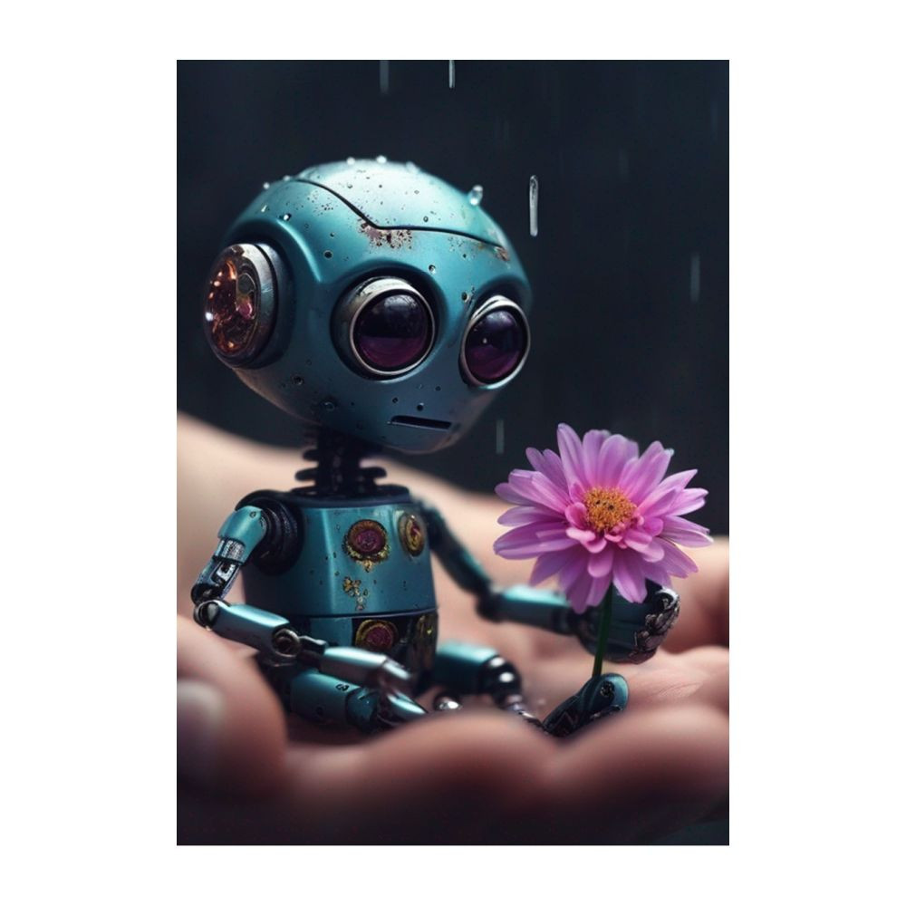 Das Bild zeigt einen traurig anmutenden, winzigen Roboter, der eine leuchtende Blume in seinen zierlichen Händen hält und in die Ferne blickt. Die Szenerie entfaltet eine Geschichte am Ende der Welt, eine apokalyptische Vision, die durch Elemente eines dunklen Fantasiereichs geprägt ist. Obwohl der Tag von Regen beherrscht wird, verleiht das sanfte, doch ergreifende Licht der Szene eine tiefe Ästhetik und fügt einen surrealen Touch hinzu. Die Hohe Detailgenauigkeit des Fotos lässt jede nuancierte Eigenschaft des kleinen Roboters erkennen – von den feinen Gliederungen seiner metallischen Gliedmaßen bis zu den sanften Reflexionen des feuchten, stählernen Körpers. Die leuchtende Blume in seiner Hand bildet einen bizarren, doch magisch anmutenden Kontrast zur sonst dämpfenden Umgebung. Das Farbspiel ist trotz der Düsternis lebhaft und intensiv: von den warmen Tönen der Blume, die in den Händen des Roboters flackert, bis hin zu den kühlen Grau- und Blauschattierungen der zu Trümmern gewordenen Welt im Hintergrund. Die cinematische Beleuchtung, angereichert durch einen dynamischen, verschwommenen Hintergrund, erschafft eine geheimnisvolle Atmosphäre, in der Licht und Schatten eine erzählerische Symmetrie bilden. In makelloser Schärfe sind die Augen des Roboters auf einen unbestimmten Punkt in der Ferne gerichtet, was ihm eine erschütternde Menschlichkeit verleiht angesichts einer Umgebung, die durch Katastrophe verformt ist. Die Beleuchtung hebt sowohl die sanfte Oberfläche der Maschine als auch die seidige Textur des Regens hervor, der den Raum durchdringt. Jedes Element des Bildes, von der hypnotischen Pflanze in der Hand des Roboters bis zu den verfallenden Gebäuden im Abstand, ist kunstvoll und elegant komponiert, was ein komplexes Bild ergibt, das sowohl schön als auch zutiefst bewegend ist. Die Komposition vereint Anmut und Komplexität in einem epischen Narrativ, während ihr extrem detaillierter und professioneller Charakter es ermöglicht, alle Aspekte dieser autarken und dennoch berührenden Szene unter dem Gesichtspunkt eines umfassenden, künstlerischen Ambientes zu betrachten. Dieses Bild stellt eine unberührte Illustration dar, die in ihrem technischen und kreativen Ausdruck sowohl kunstvoll als auch höchst atmosphärisch ist.